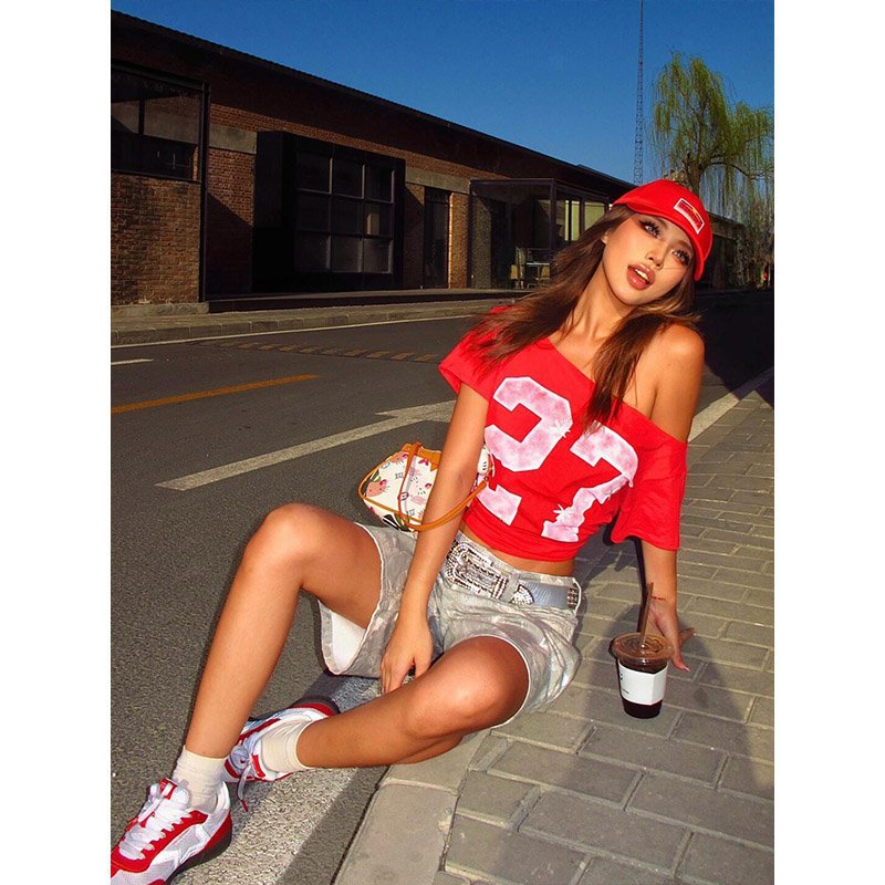 オフショルダー新デザイン Y2K27 斜め肩ホットガール Tシャツレター半袖アメリカンルーズトップ女性のための夏 2025