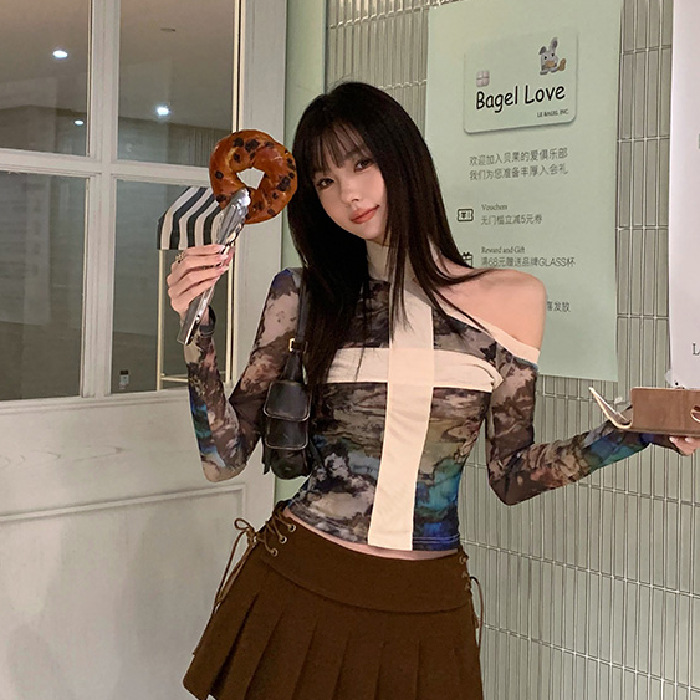春と秋のスリムフィットブルーミング長袖Tシャツレディースプリントオフショルダースラッシュネックボトリングシャツホットガールトップス痩身デザイン
