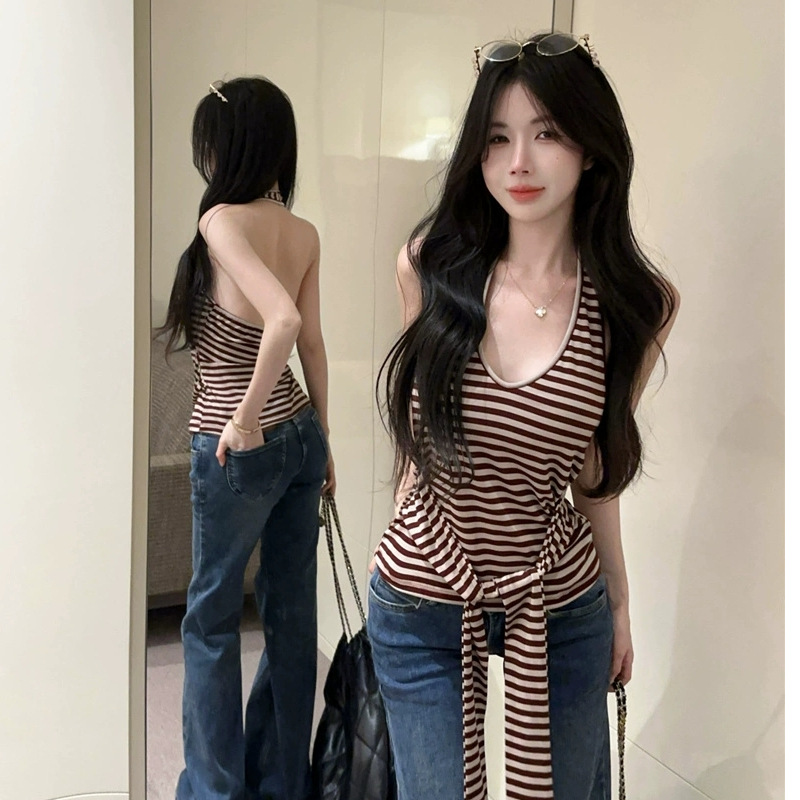セクシーな季節のチューブトップストライプキャミソールレディース夏Vネックユニークなタイ風ホットガールタイ風美しい小さなホルターネック