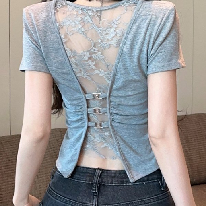 中空バックレスホットガールスリム半袖Tシャツトップ女性用香港スタイル夏スプライシング右肩ウエストレトロラウンドネックレース