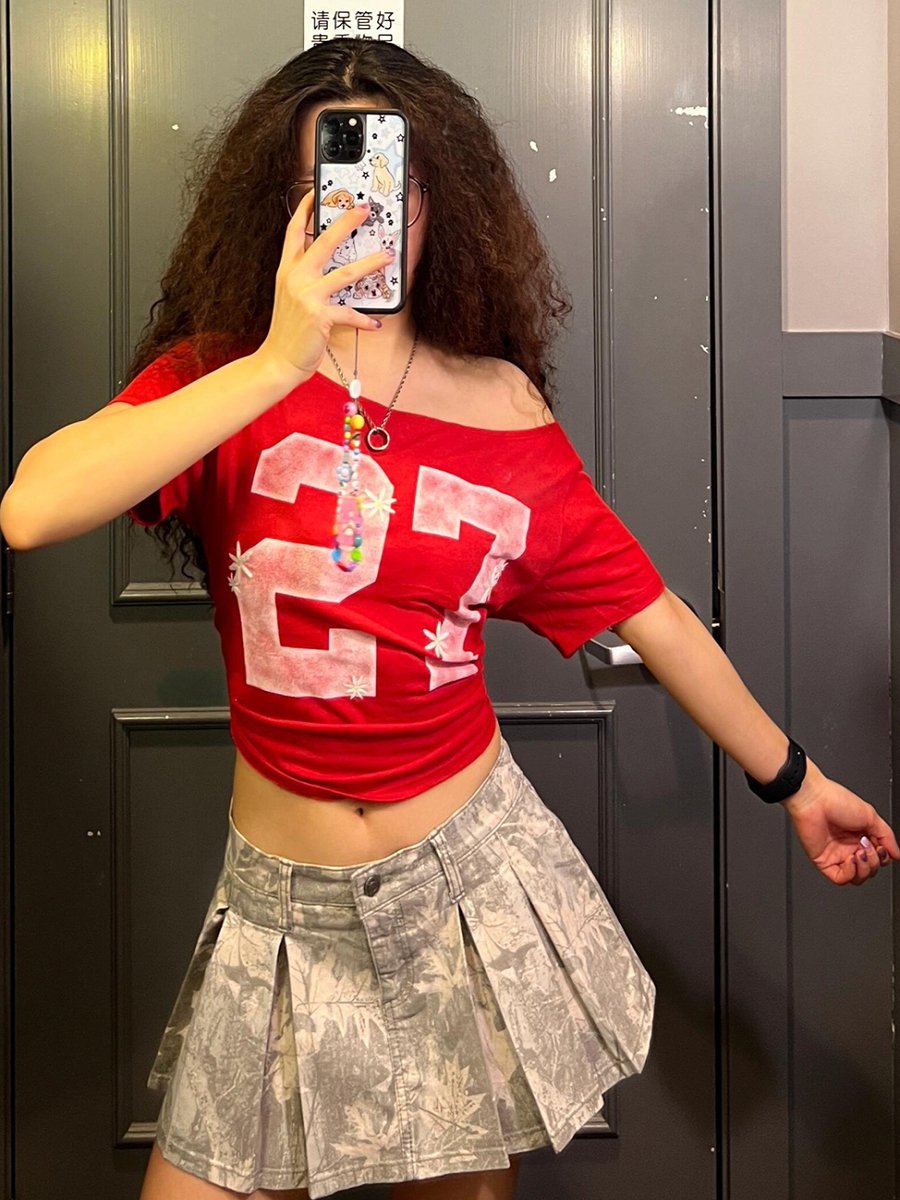 Tシャツシックな純粋な欲望の女性デザインプリント半袖夏のホットガール新しい赤いオフショルダートップ斜め肩ニッチ