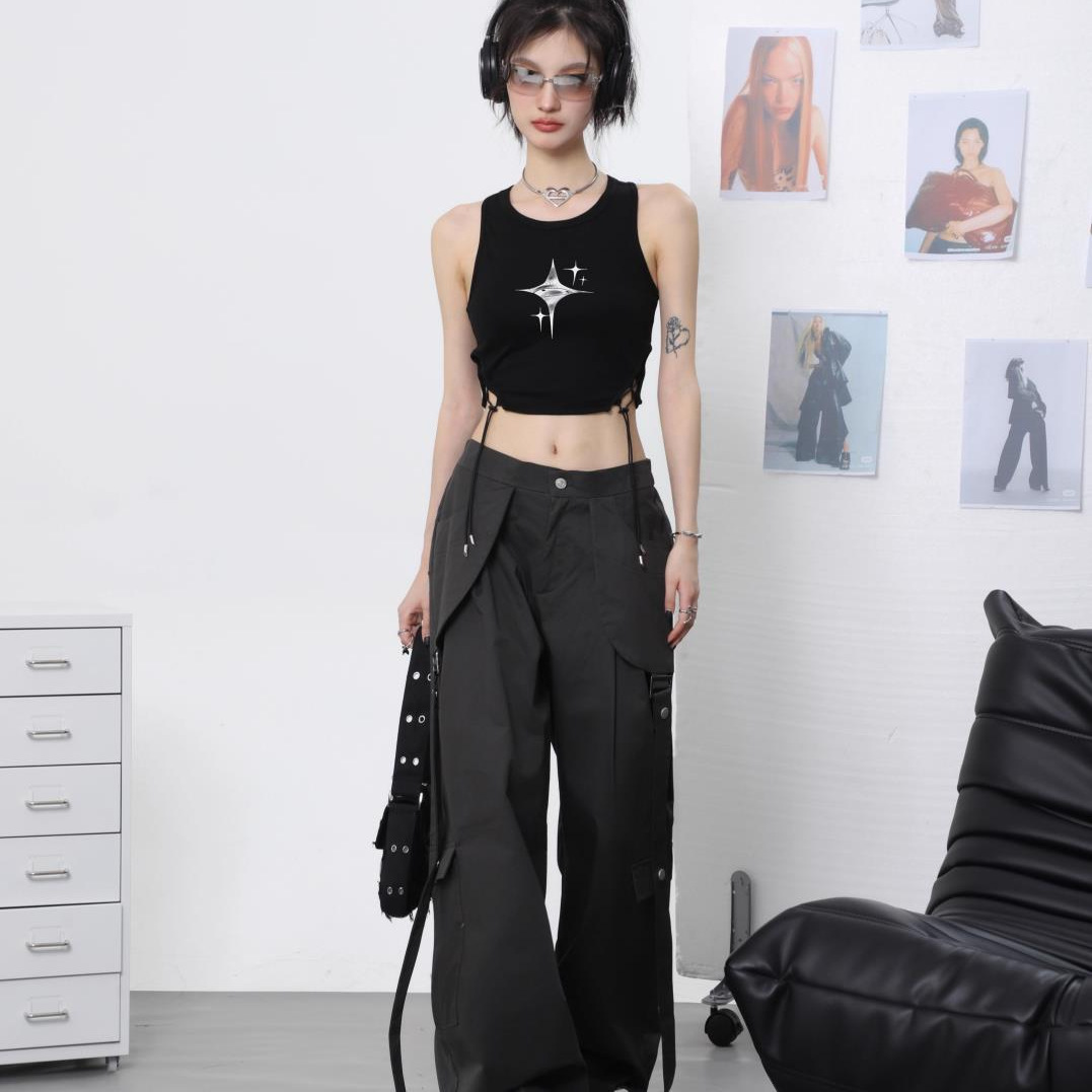 ショートトップデザイン夏スタイルスターショートアウターウェアスリムストラップスリムフィット2025プリントベストサスペンダー女性用