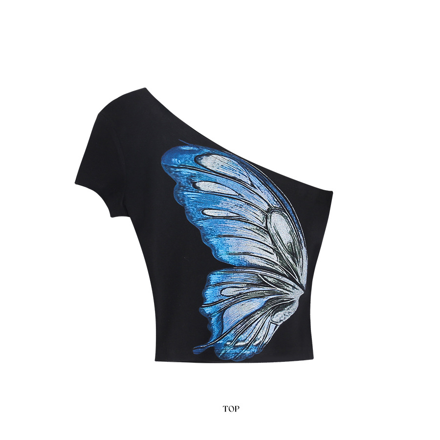 韓国風ショートオフショルダーTシャツ、万能トップス、ホットガール斜め襟夏新作半袖ファッションクラシックバタフライプリント