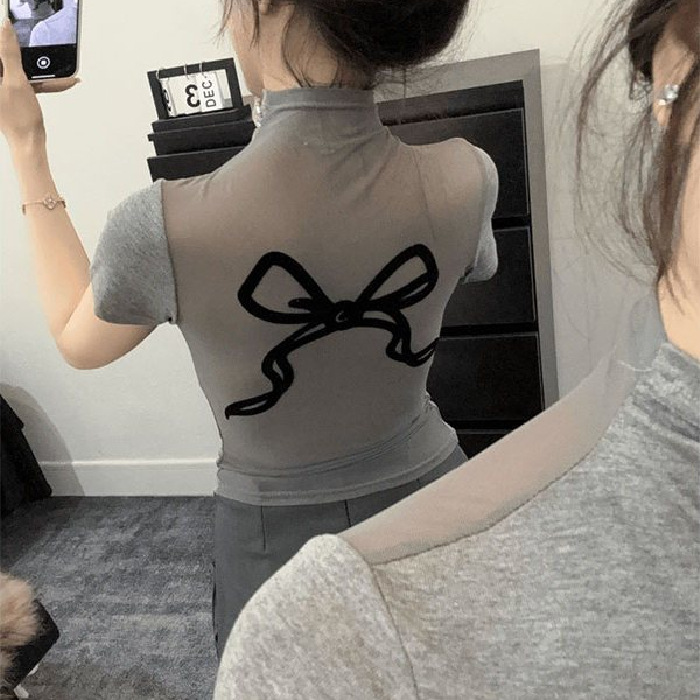 Tシャツ黒スリムボウ半袖女性のホットガールショルダーショートメッシュデザインオープンバック春と夏