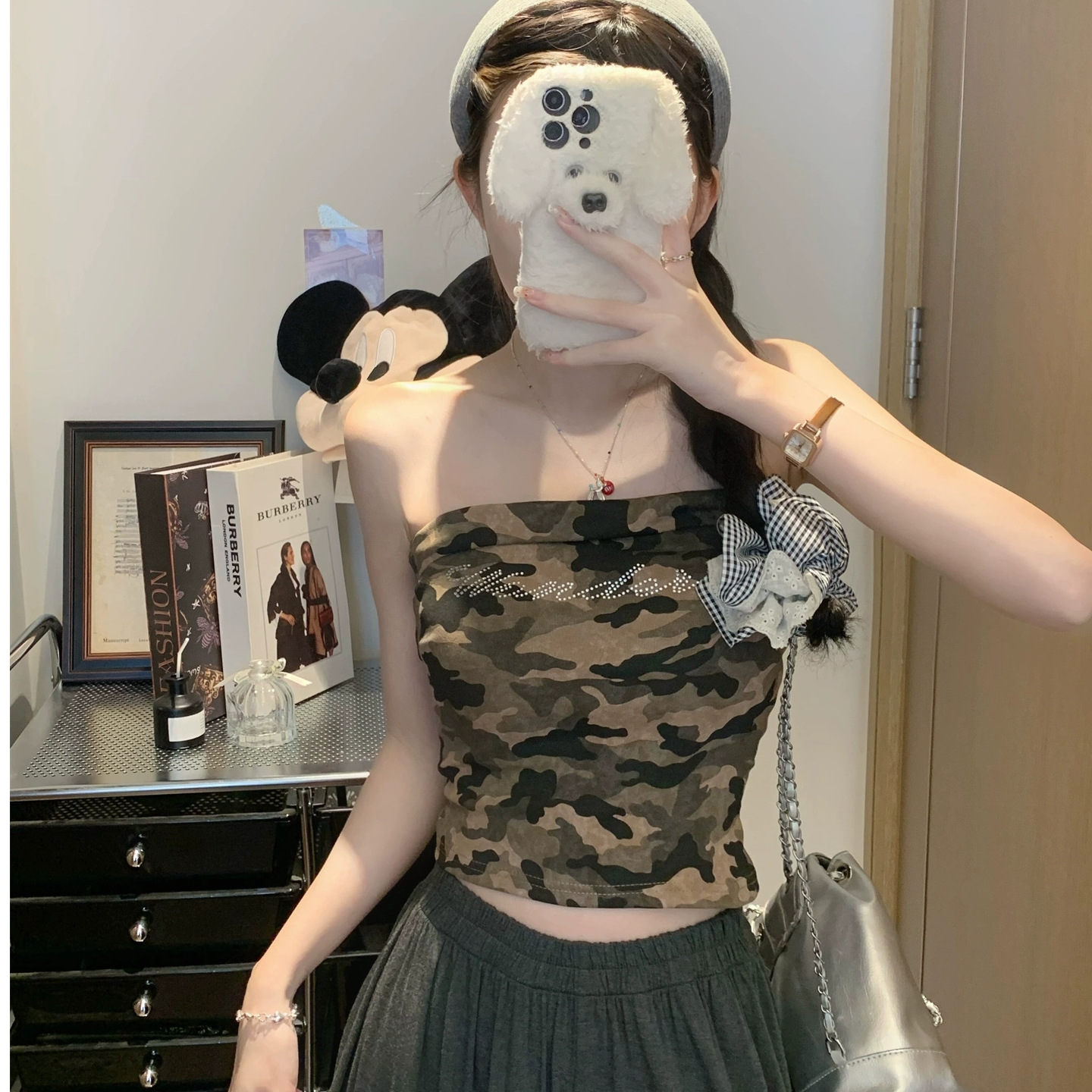 ショートレトロホットガールホットダイヤモンドチューブトップ迷彩プリントレディースノースリーブベストスリムアメリカンサマーデザイン