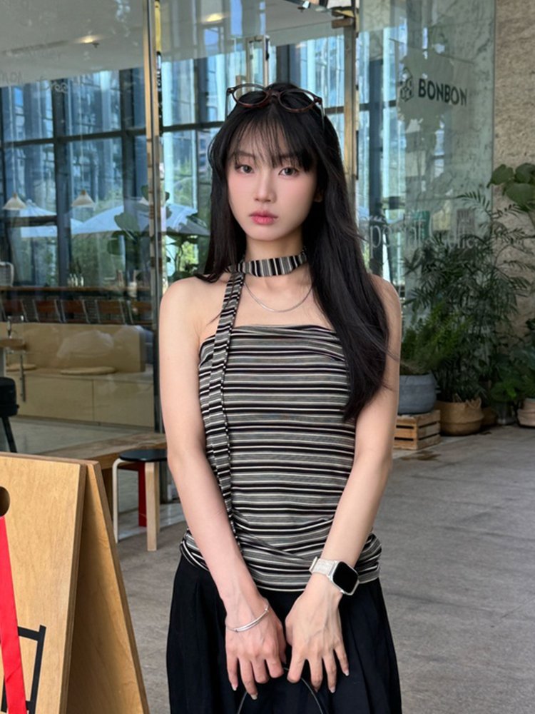 春夏アメリカンセクシーノースリーブトップレトロアウターストライプベスト女性ホットガール痩身黒スリムチューブトップ