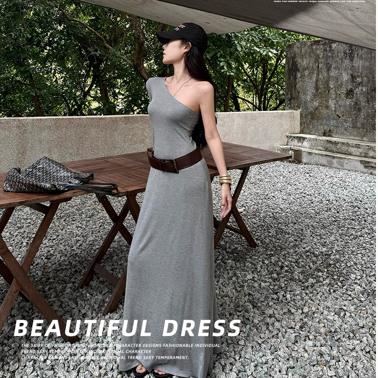 今年人気の新作痩身ホットガールロングスカートヒップカバーシングルショルダー長袖ドレスウエスト露出2025斜め襟