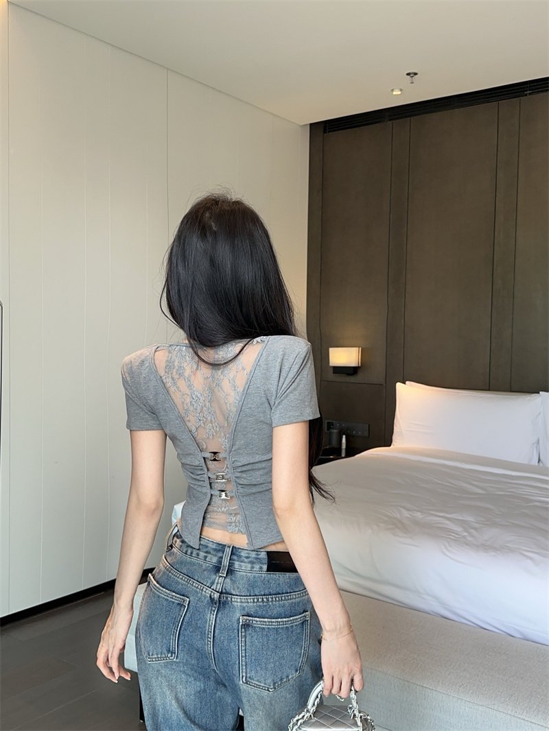 夏のパッチワークスリムフィットトップ、女性のセクシーな中空レースバック、フレンチシック、2025、気の利いた機密性と美しい気質