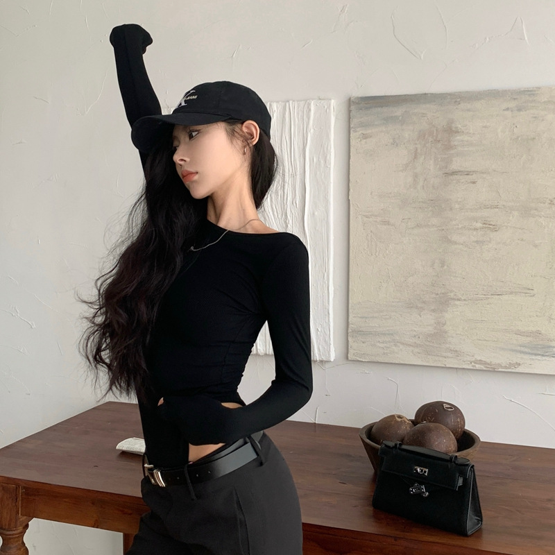 スリムウエストバックレスブラックスタイル新しいスリムニッチトップ春と夏のセクシーなホットガール長袖Tシャツ女性のデザイン