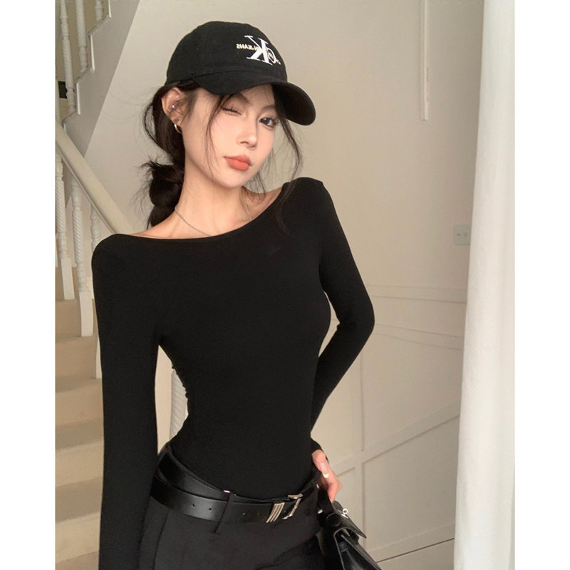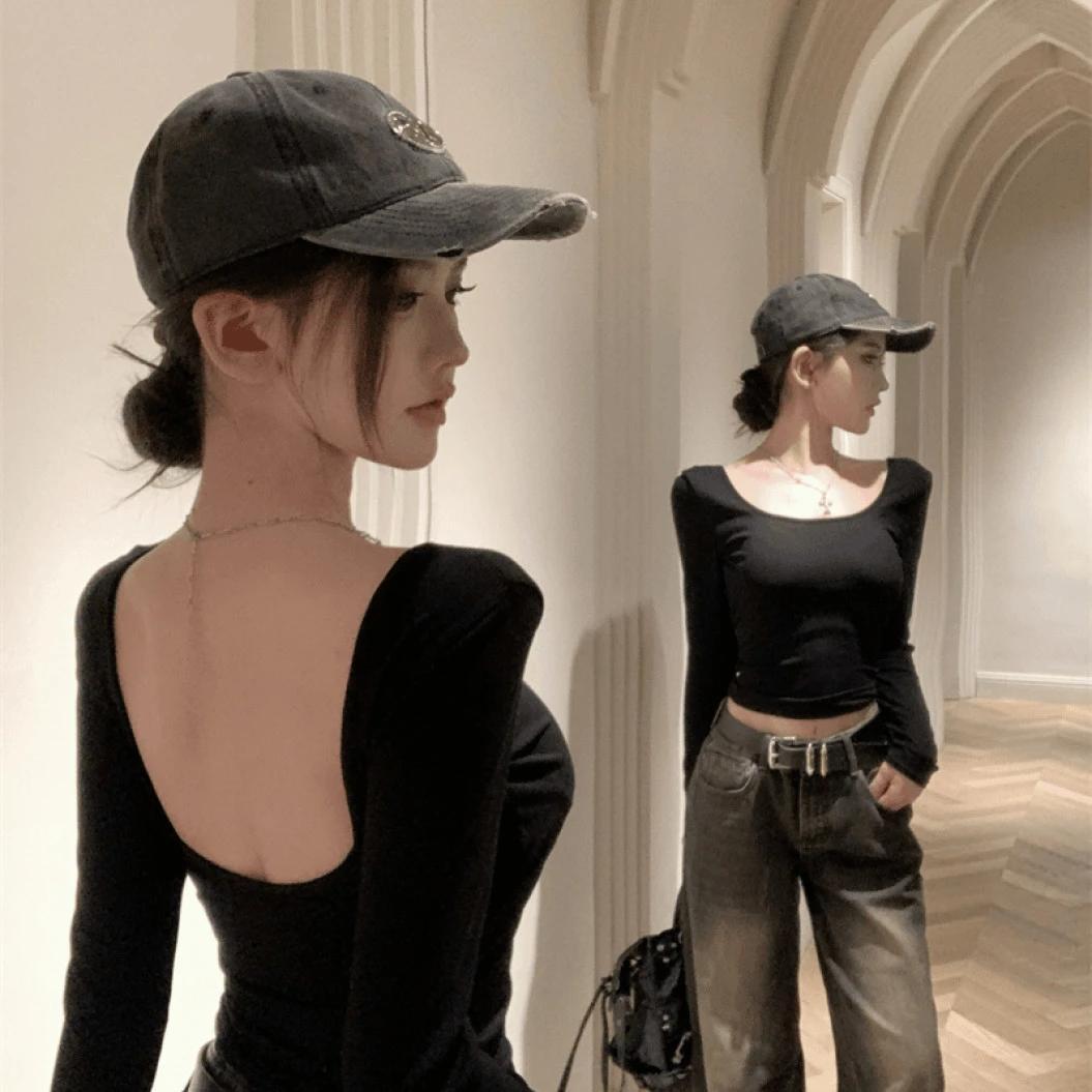 ホットガールヨーロッパとアメリカのボトリングトップスタイルプルオーバー長袖Tシャツフェミニンな新しいニッチスリムフィット2025バックレス春夏
