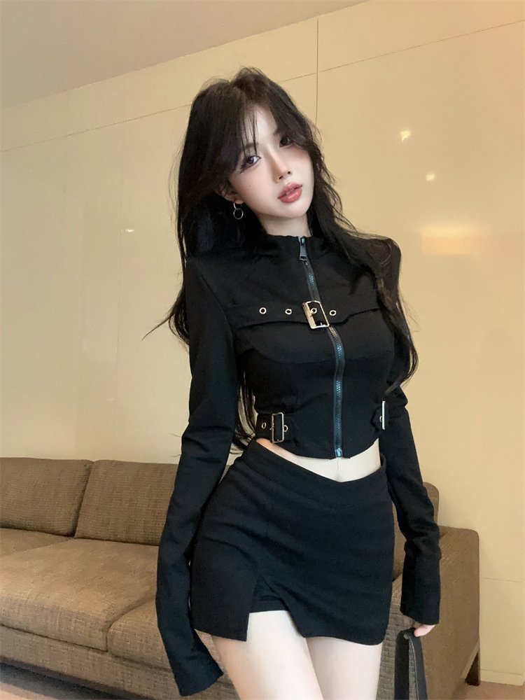 スリムで甘くてクールな春夏トップス、バックルジッパー、ホットガール不規則なメタルスタンドカラーレイヤリングボトリングシャツ女性用