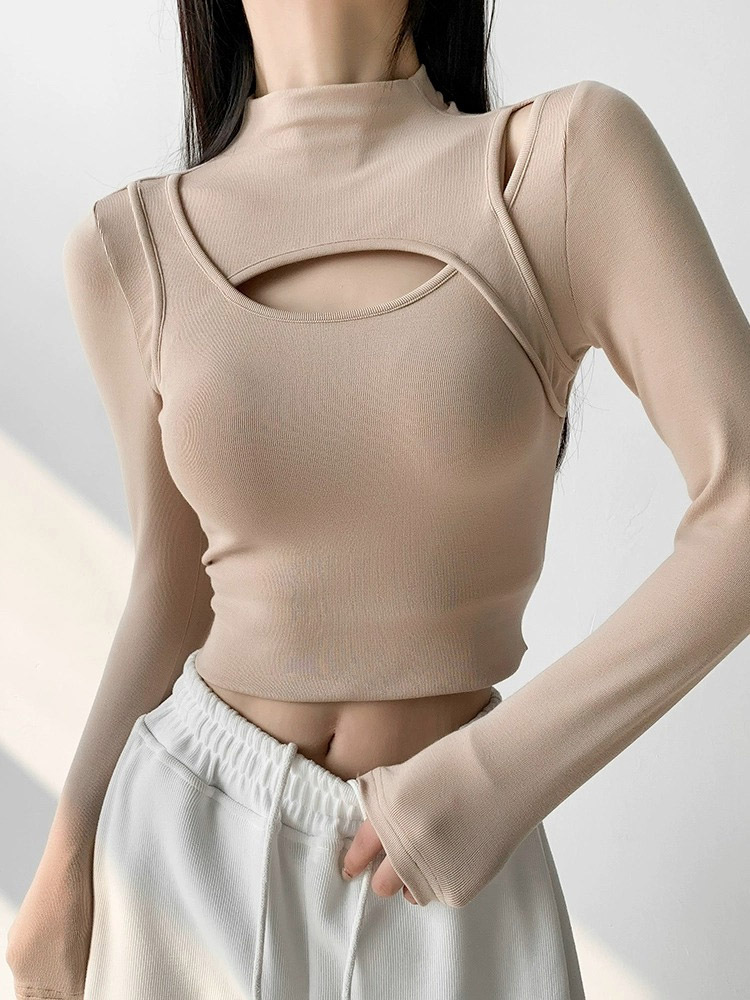 長袖デザインの中空トップス、2025秋の新作、女性用のユニークなハーフタートルネックボトムシャツ、スリムフィットとリッピング