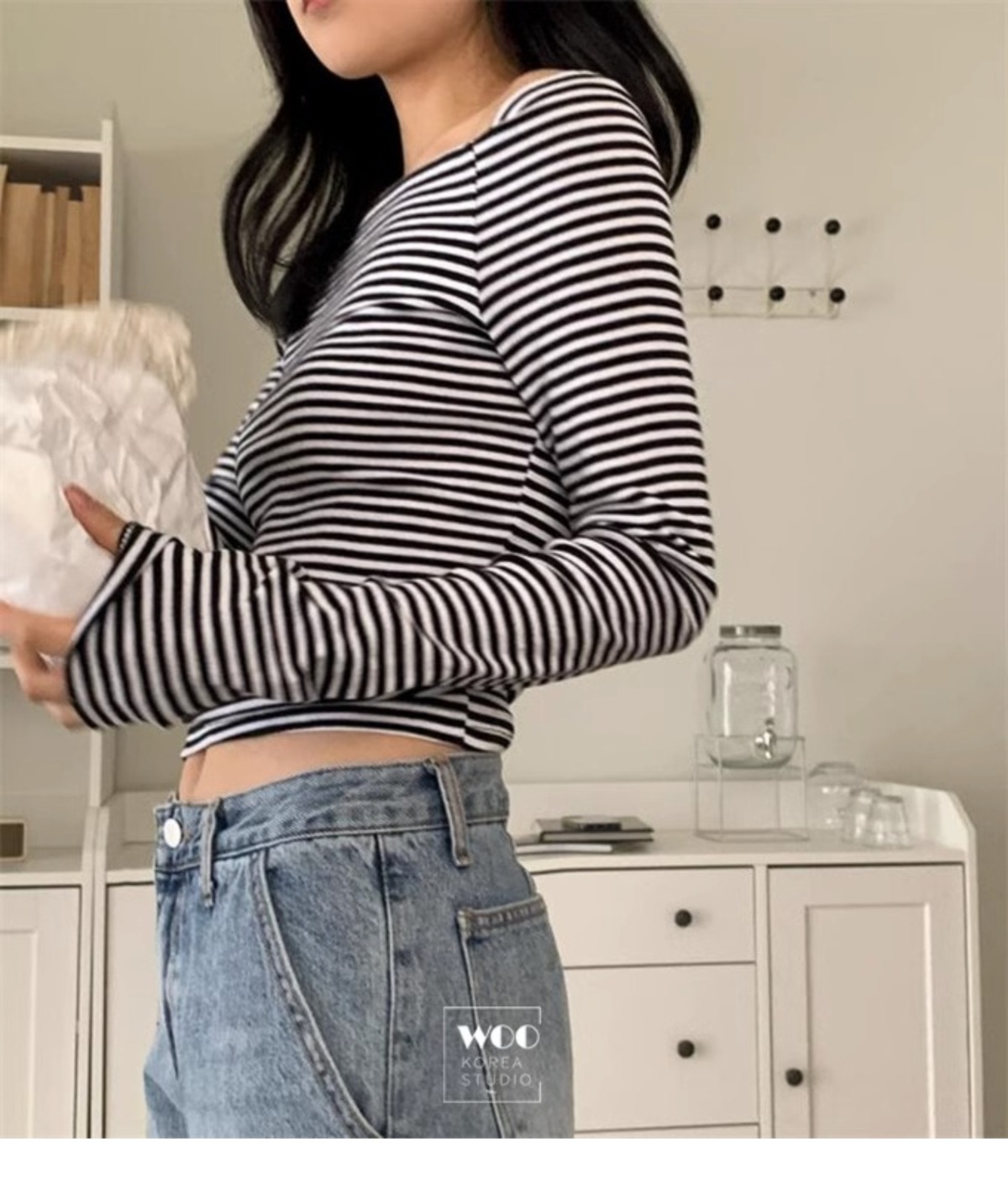 ストライプ長袖Tシャツスリムボトムストップスホットガールスリムフィット万能ワンショルダーハンガーウェスト秋冬純情2024