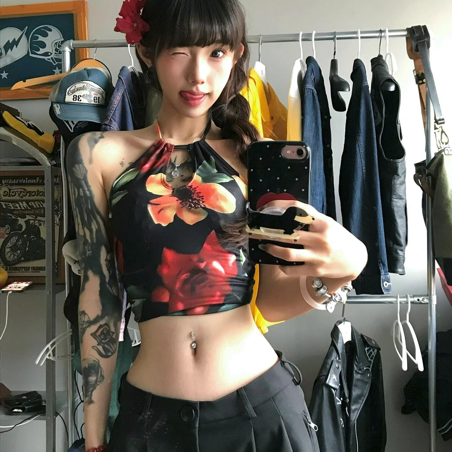 中空トップデザインキャミソールホットガールホルターネックレトロスリムセクシーな植物花柄ドロップ型