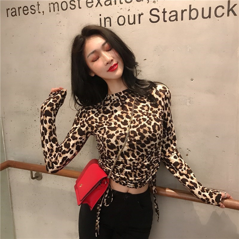 ジャズダンスハイウエスト巾着ピュアディザイアシャツ女性用秋長袖控えめトップ気質ヒョウレースTシャツシェーディング