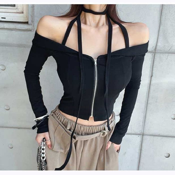スリムオフショルダー秋スリムブラックホットガール中空トップとアメリカン長袖Tシャツ女性のセクシーなボトリングシャツ