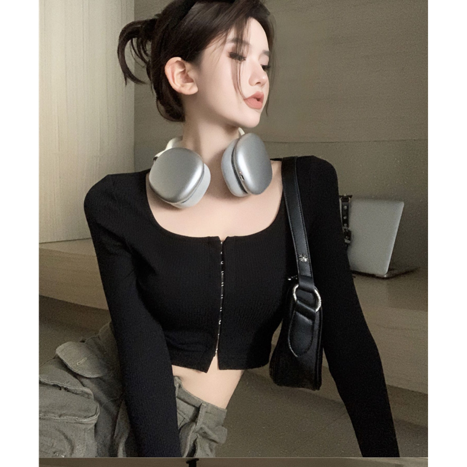 長袖のやせた高さの短いタイプの臍のカーディガンの上着の方襟の女性の黒いtシャツの腰は春秋2025を現してニットを身に着けます。