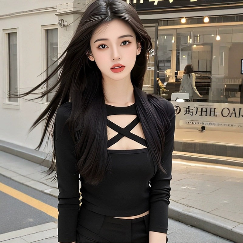 セクシーなラウンドネックピュアディザイアホットガール秋ハイエンドセクシーな黒のショートトップTシャツ長袖ライトラグジュアリー中空