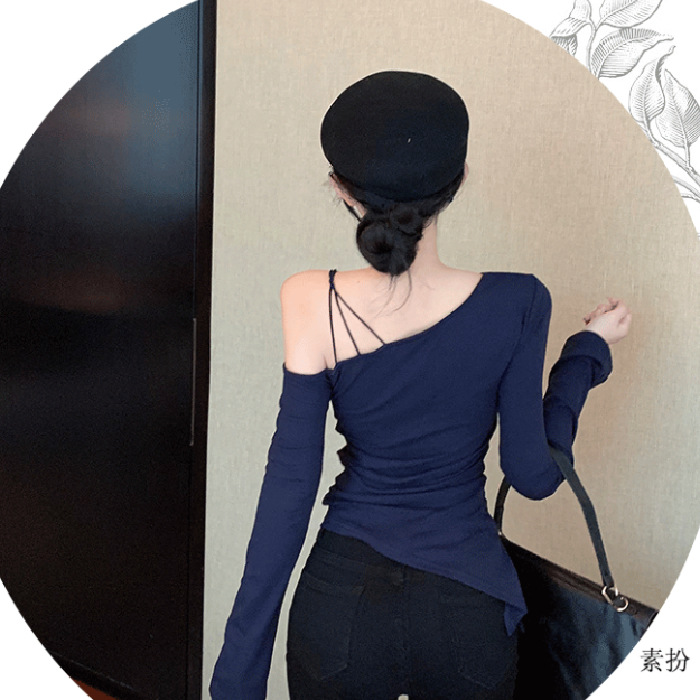 レトロホットガール甘い中空特徴ニッチTシャツ非対称デザイントップ女性のセクシーなオフショルダー長袖