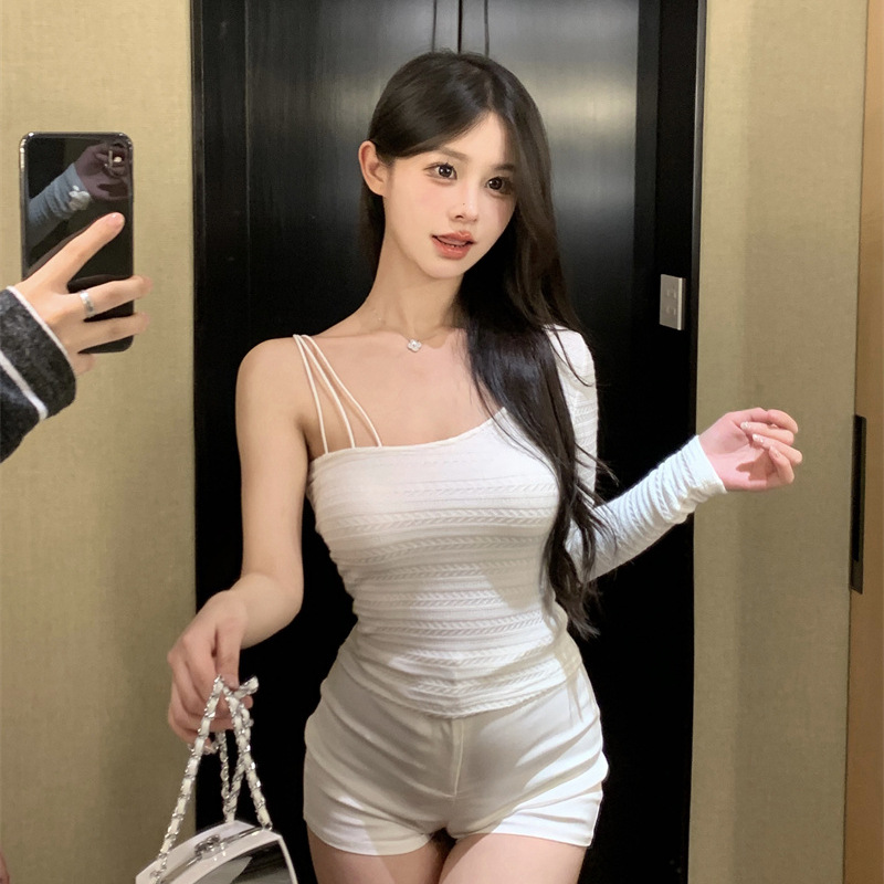 スリムフィットトップス、スリムなスラントカラー、シックな鎖骨、春の純粋な欲望、白いTシャツ、レディースハイストリートシーリング、レディースワンショルダーアメリカンスタイル