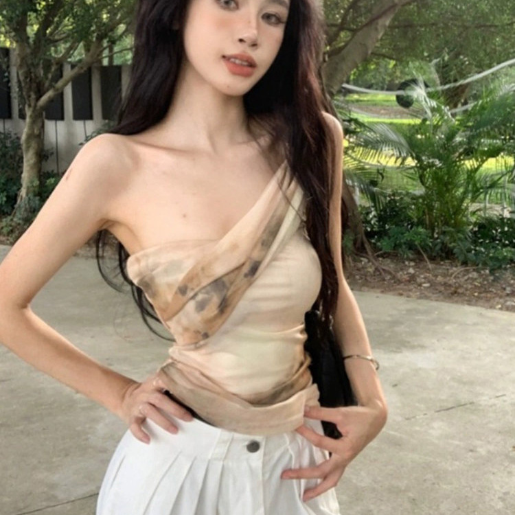 女性用アウターウェア春夏ベストサスペンダー、スリムデザイン、メッシュニッチ、スリムプリーツショートトップ、斜め肩、ホットガール