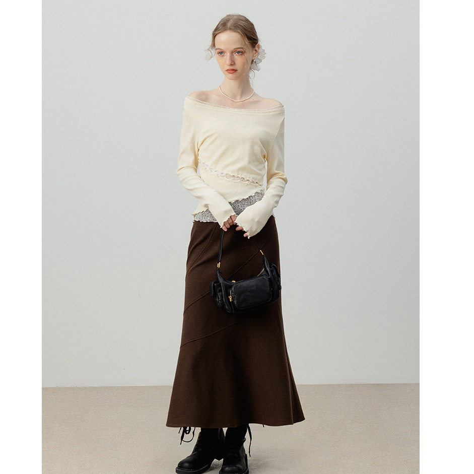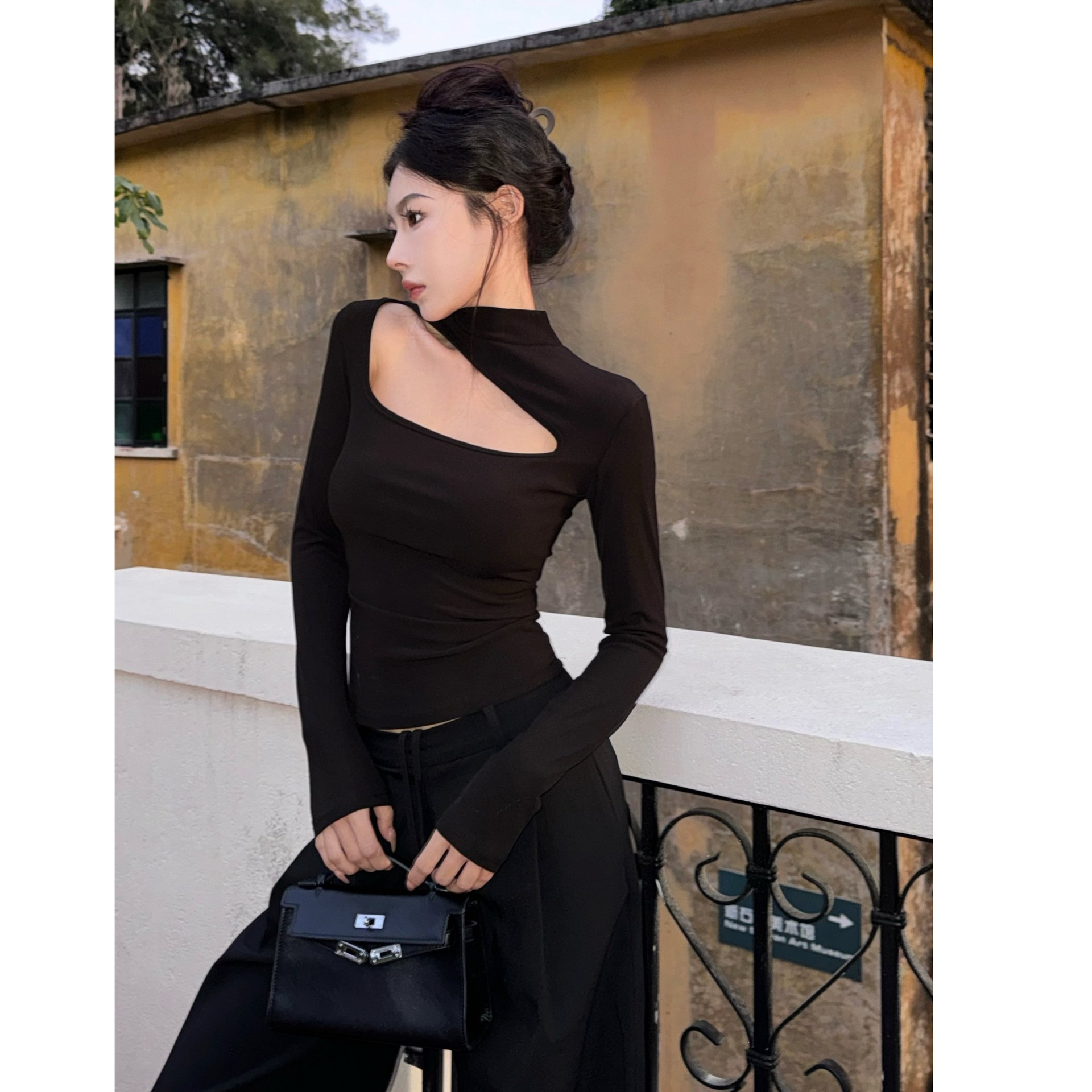 デザインピュアデシヤ長袖Tシャツレディースレトロハーフタートルネックアメリカンスタイル鎖骨ホルターネックニッチ露出スリムボトムストップ