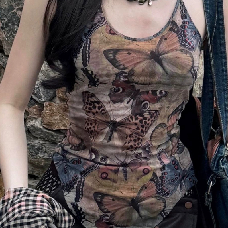 I字型アメリカンプリントサスペンダーアウターノースリーブトップ女性用蝶レトロベスト不規則なスリムフィット夏のホットガール