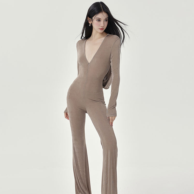 ズボンの女性の長袖のヨガの灰色の連体の服の2025Vの襟のtシャツのセクシーな新型のアメリカ式の百合のレジャーのスポーツのギャル