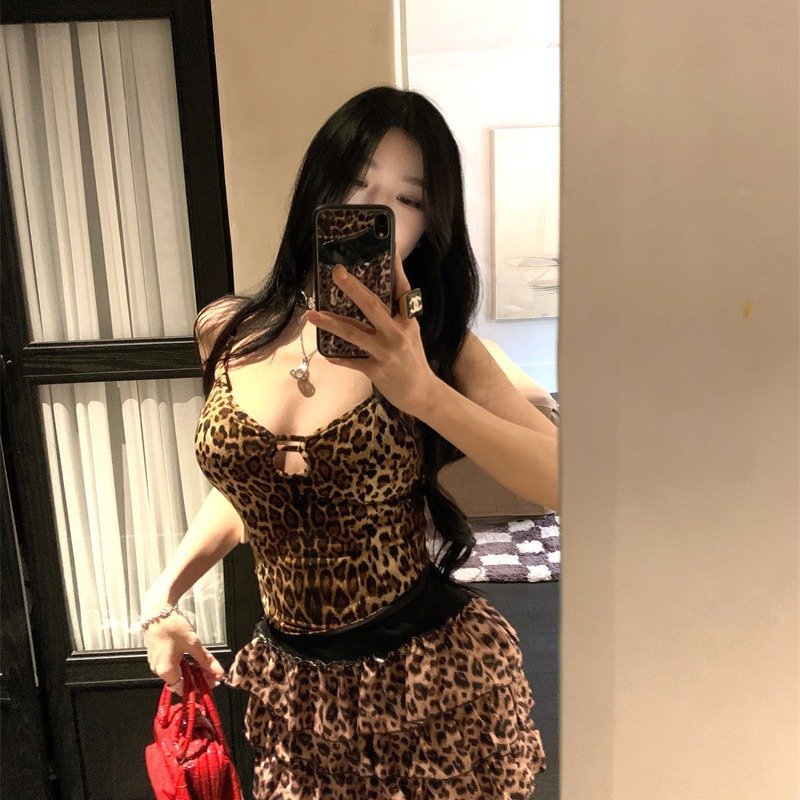 トレンディなトップスホットガールヒョウ柄スリム中空ボトムシャツ春夏ベストサスペンダースリムトレンディ多用途アメリカンスタイル新スタイル