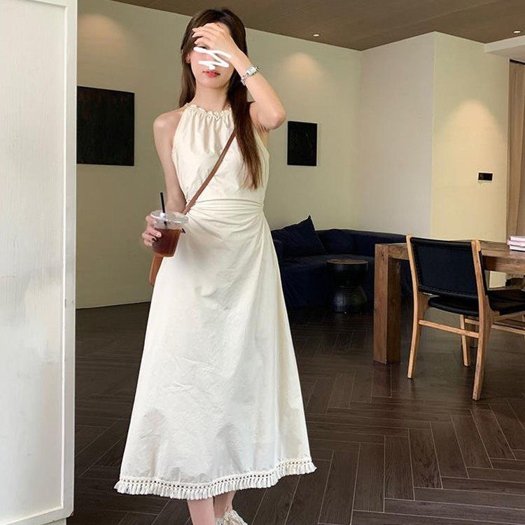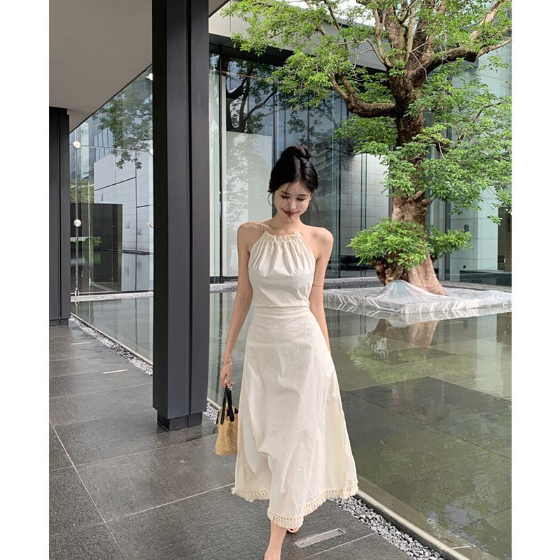 シックなストラップ付きレディーススリムで美しいニッチスカート中空新作夏休みデザインバックレスドレススタイル