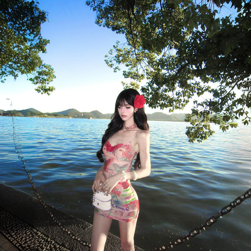 小柄なプリントシーズンスリムフィット海辺セクシーなヒップカバーショートスカートホリデーウエストピンクサスペンダードレス女性夏