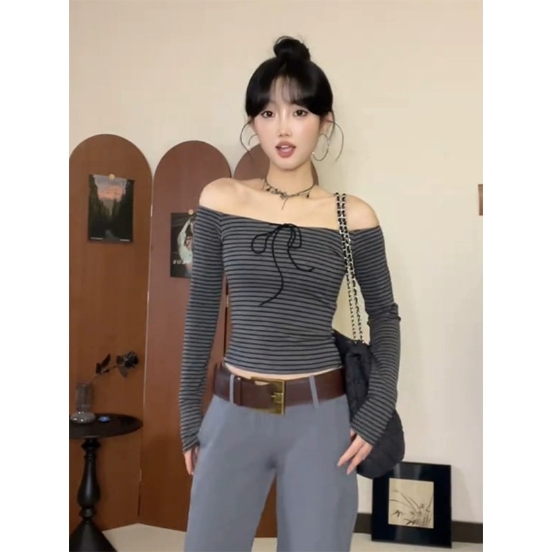 一字の肩の婦人服の小衆は肩のストライプを漏らして、上着の秋のストラップ感の長袖の設計は身を修めて底のシャツの女性を打ちます。