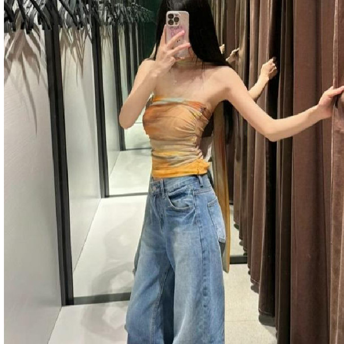 チューブトップノースリーブトップセクシーなショート2025新しいホットガールプリントクロス春と夏の純粋な欲望白人女性