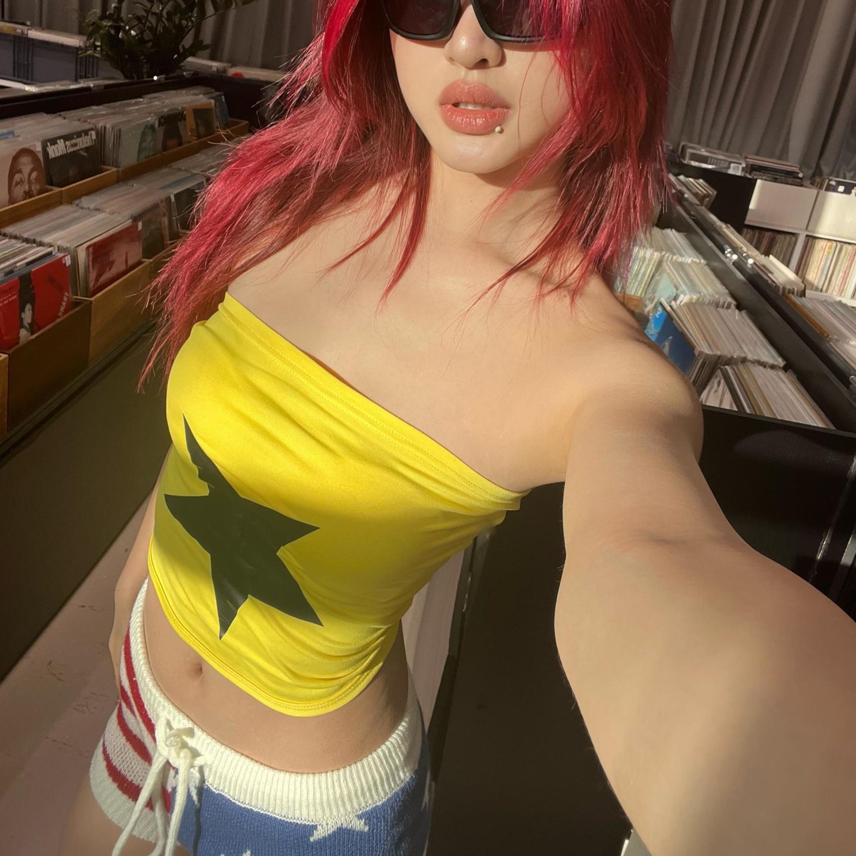 スリムフィットストリートプリントトップ、ファッショナブルなデザイン、スターウーマン、シンプル、レトロ、アメリカンチューブトップ、ホットガール、多用途