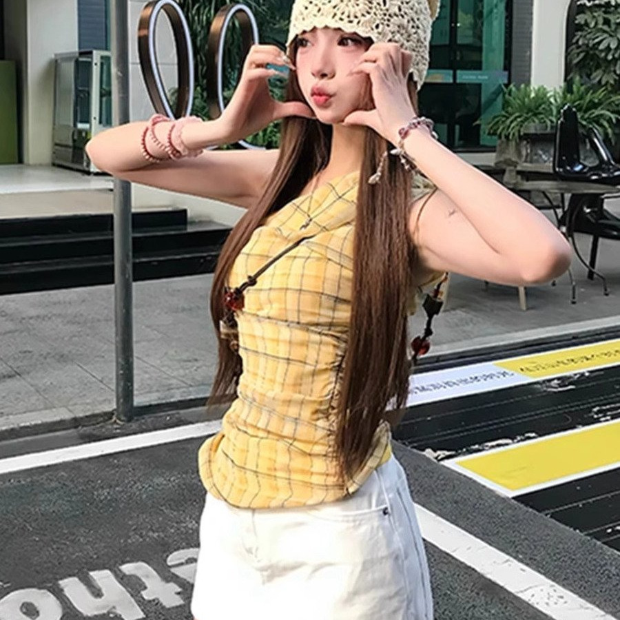 シックなアウターウェア黄色の新しいノースリーブトップ女性ホットガール春と夏のキャミソール斜め肩ユニークなチェック柄オフショルダー