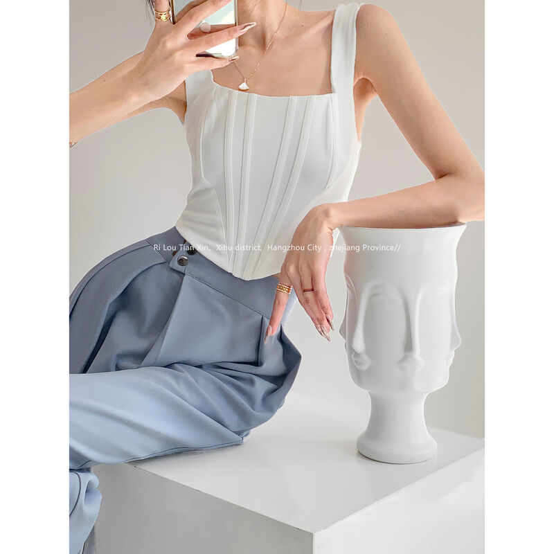 2024 ヨーロッパとアメリカンスタイルのショートへそ出しフィッシュボーンホットガールトップ女性の夏のスクエアカラーシーズンウエスト新しいキャミソールボトム