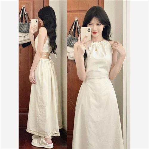 夏フレンチタッセル2025ピュアディザイアスタイルリトルブラックドレスウエスト露出中空新作ロングスカートサスペンダードレス女性用