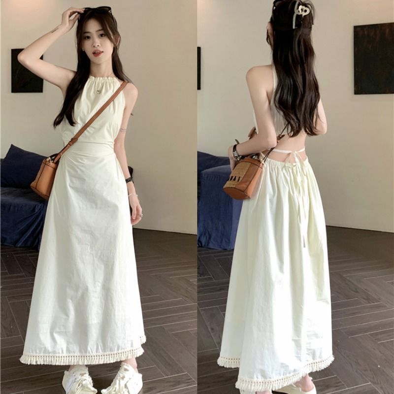 女性用ドレス、夏の海辺の休暇ビーチドレス、気質ホルターネックサスペンダーシーズンウエストフレンチロングドレス、背中中空