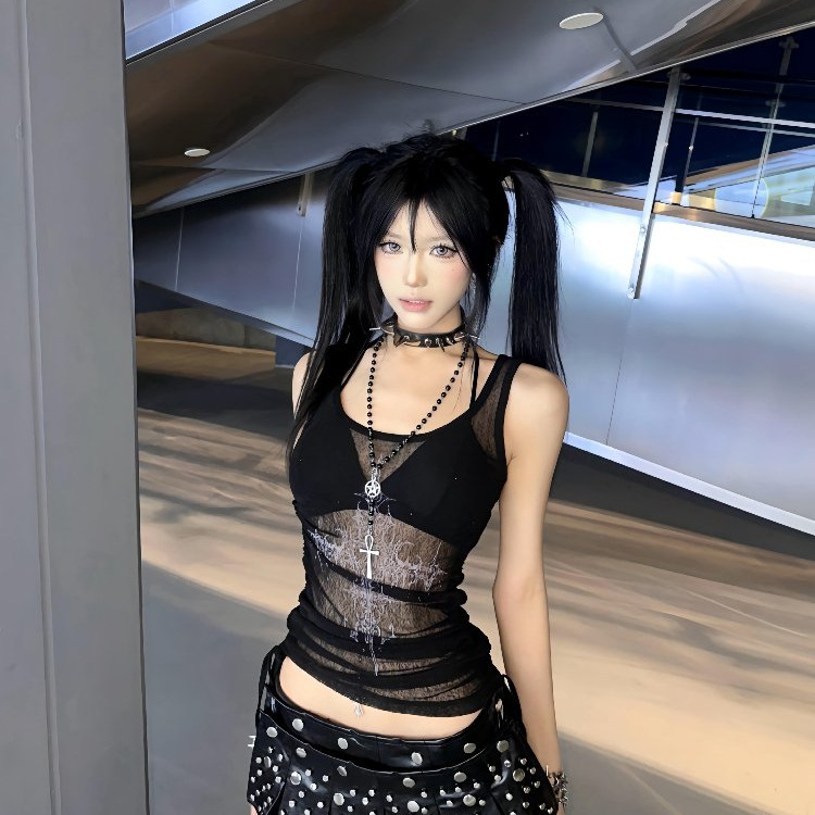 プリーツレトロデザイン新しいアメリカンスタイルレースアップホットガールセクシーなわずかに透けるサマーキャミソールプリントスリムフィットトップ