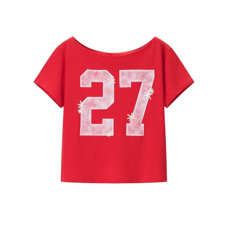 赤い美しい斜め肩のルーズ半袖Tシャツプリント美しいトップレディースデザインショートスタイル新しいスタイルユニークなアメリカンスタイル