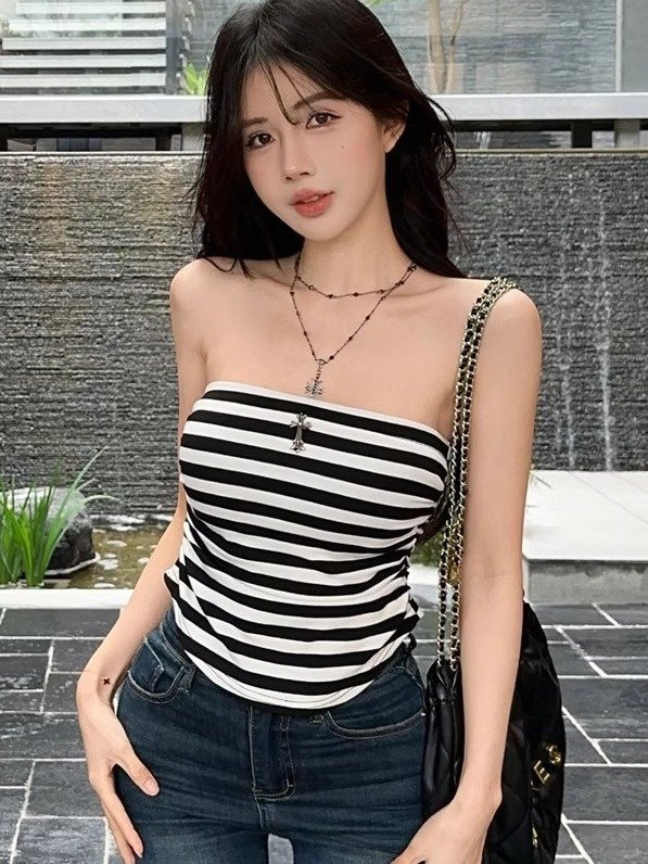 スリムフィット、ストライプ、美しいバック、チューブトップ、コントラストカラー、新作春夏キャミソール、フェミニンなホットガール