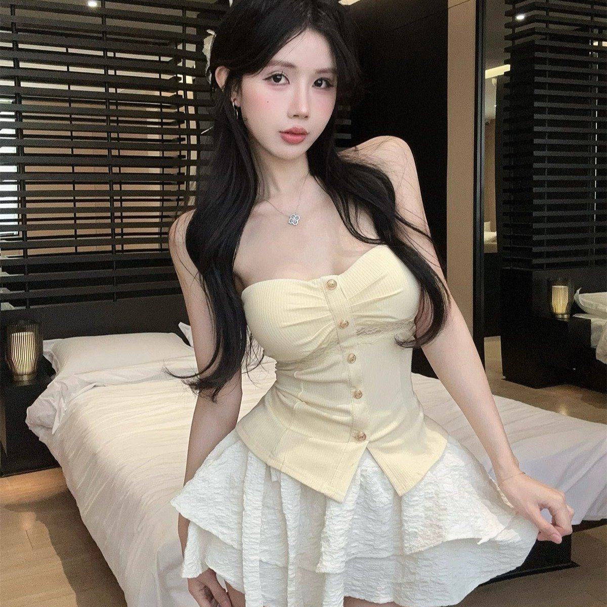 春夏の新作チューブトップセクシーなホットガールスプライシングレースデザインショートトップ女性の純粋な欲望ニッチスリット