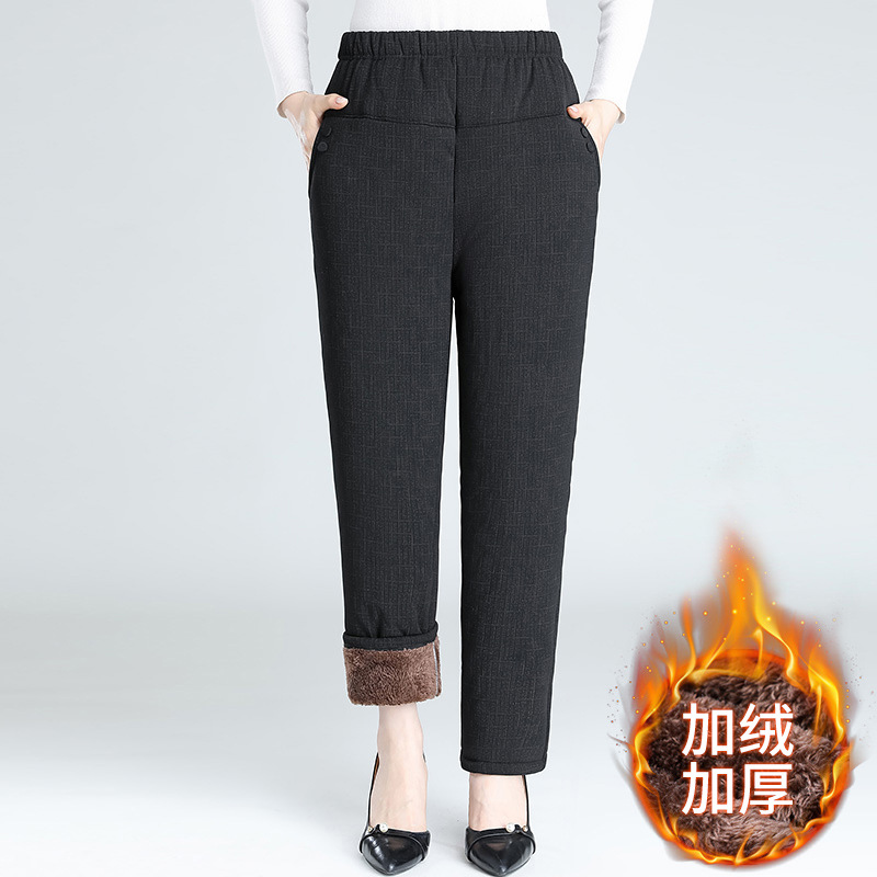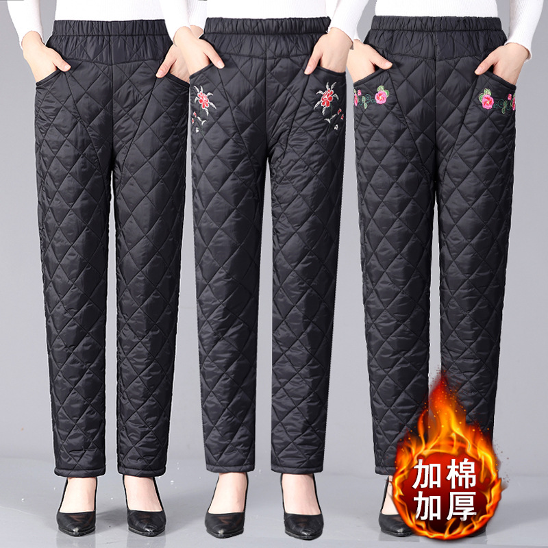 中高年の女性の羽毛の綿のズボンの黒いお母さんの保温のズボンの外はおばあさんの秋冬を着て綿をプラスして厚いストレートのズボンの女性をプラスします。