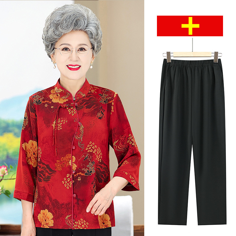 お年寄りの夏服の女性のスーツのおばあさんの新しい中国式の国風のシャツのお母さんの洋風の2セットのおばあさんの上で服を着ます。