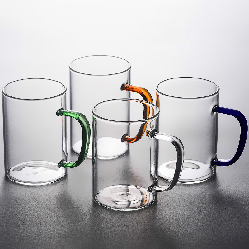 ハンドル付き家庭用ウォーターカップ、高ホウケイ酸ガラスカラーハンドルカップ、厚手のガラスティーカップ、直火、電子レンジ加熱、保温可能