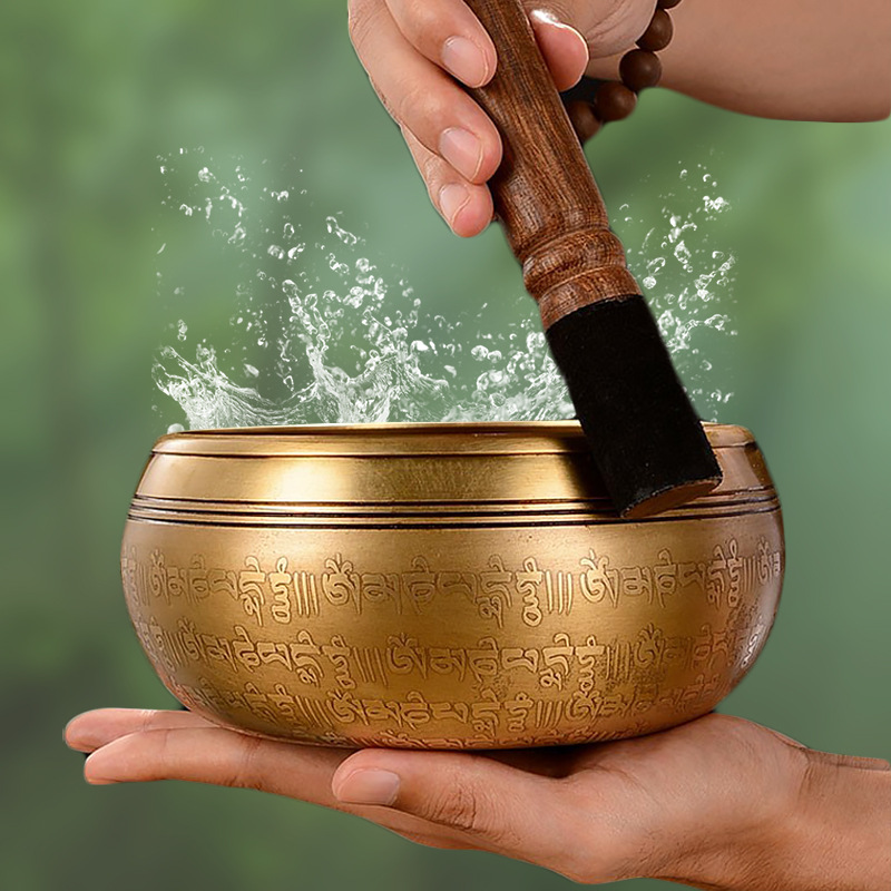 ネパールの手は鉢の音の碗をほめてヨガします。