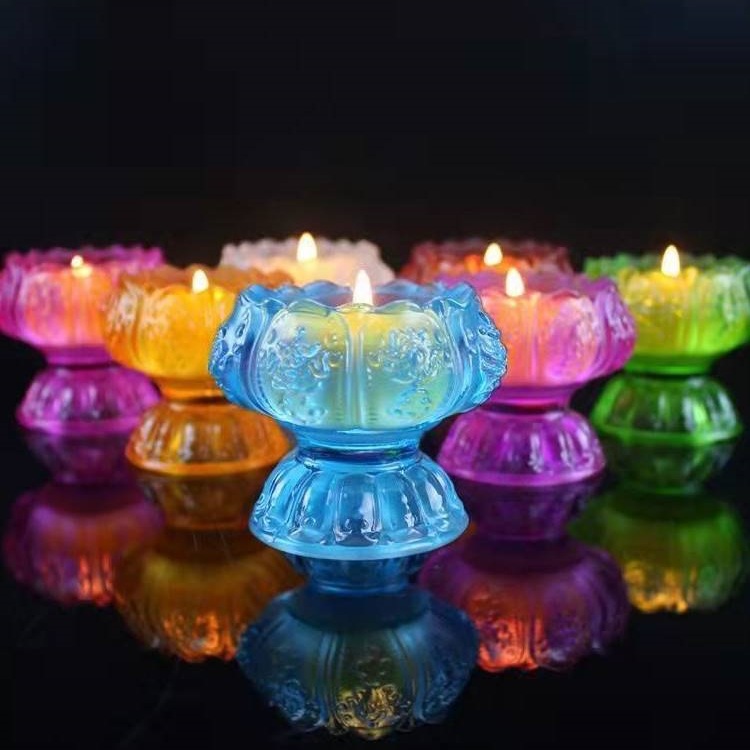 メレンゲランプ台座七色蓮花灯燭台家庭用供灯仏前聖蓮水晶瑠璃純銅長明灯座