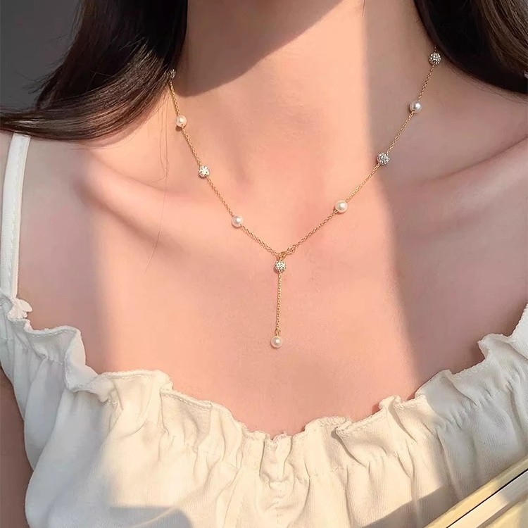 女性用ベビーブレスパールネックレス、スペーサーパール、輝くダイヤモンド、ニッチなハイエンド鎖骨チェーン、Y字型チェーンネックレス