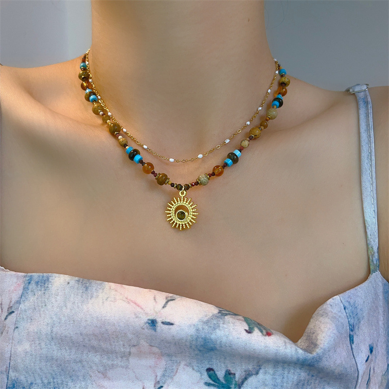 チタン鋼天然石サンペンダントネックレスクロスボーダーメイラード気質鎖骨チェーンエスニックスタイルスタッキングアクセサリー