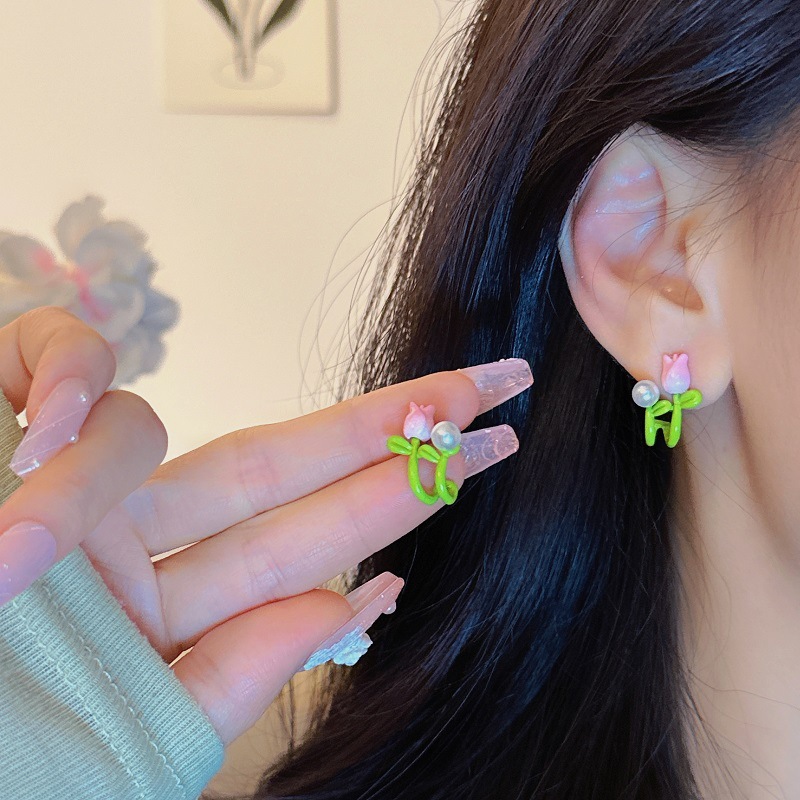 新しい花紅葉緑甘いチューリップ貝珠イヤリング森系小清新花銀針耳飾り女性卸売り